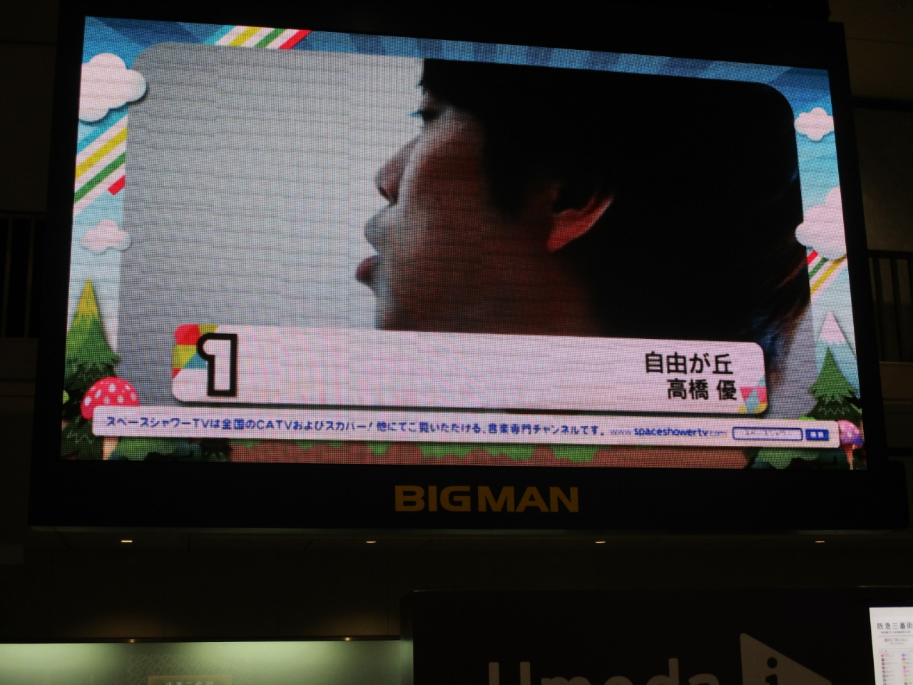 梅田の待ち合わせの名所です。阪急梅田駅の改札を出て下に降りたところ。紀伊国屋書店の入り口横です。今見るとテレビはそれほど大きく感じません。平日の昼は人込みもなくゆったりしています。近くでイベントもよく行われています。(今はどうなのかな・・)