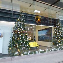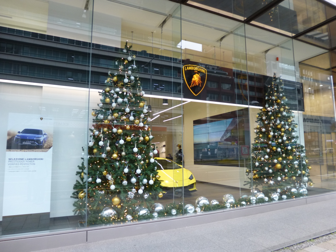青山通り沿いにある「CORNES 青山」のウインドウ越しには今日も超高級外車が並んでいました。加えて、クリスマスツリーの姿もあり、青山らしいエレガントな雰囲気でした。外国人カップルがランボルギーニを背景に写真撮影する姿が見られましたが、その気持ちはよく理解できます。