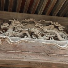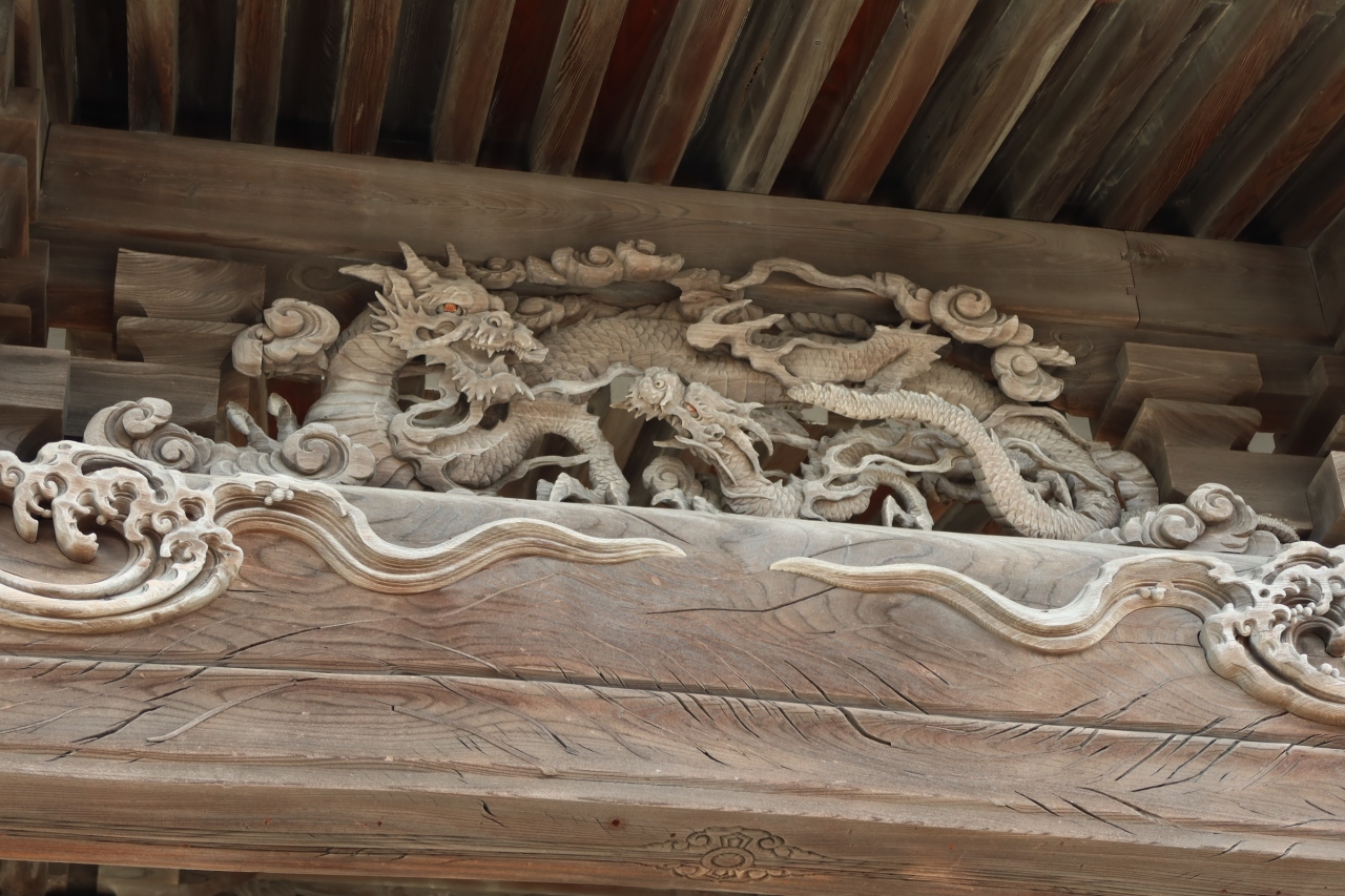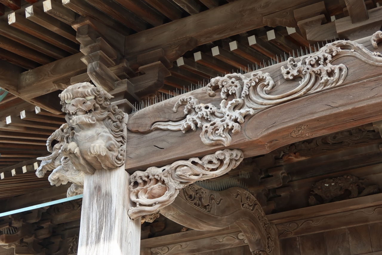 お寺の建築を見るのが好きなので、いつも見るポイントは同じなのですが、こちらは向拝桁に設けられている彫刻が良かったです。モチーフは龍と波(雲の波?)で、それ自体のデザインもさながら眼が赤くなっていたのがとても印象的でした。他にも海老虹梁や像、唐獅子の飾りも良かったです。鳥よけの針がより雰囲気を良くしていました。
