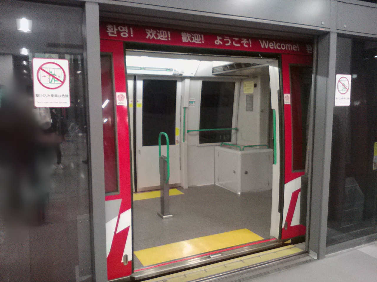 国際線の搭乗ゲートのあるウイングとイミグレのある本館とを結ぶ“電車”です。正確には鉄道扱いではなくエレベーターという扱いのようです。今まで飛行機を降りてからこんなモノに乗ったことがないのでちょっと新鮮でした。どこかの国の空港のように延々歩くのが普通だと思っていましたから。気になったのでウイングの端から本館中央まで測ってみました。最大マックスで800mほど。この数字だけ見るとやっぱり必要なんですかね。