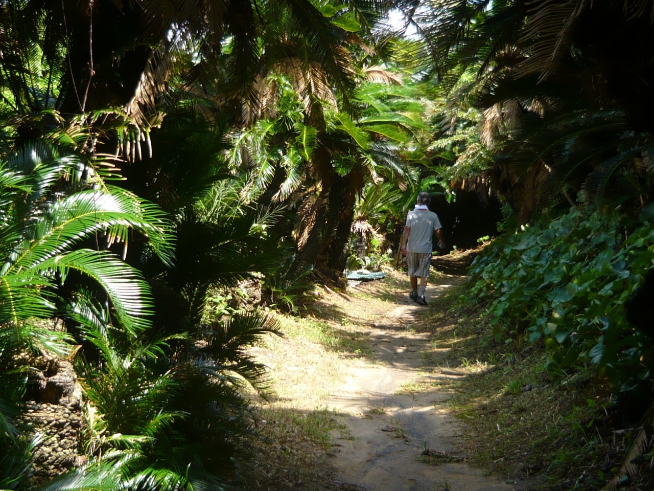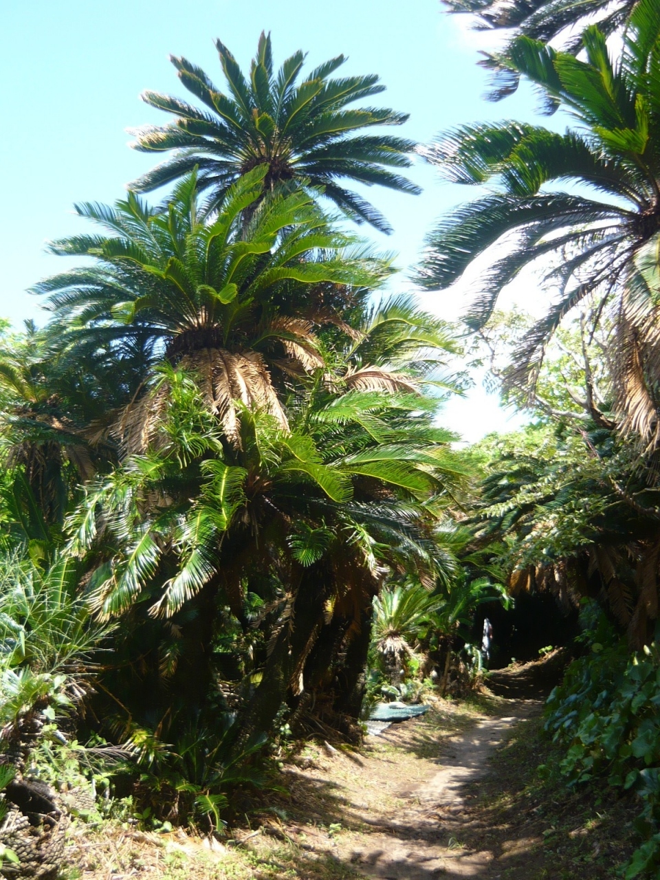 徳之島の最北端の東端にあります。ソテツが長さ200mほどにわたってトンネルの様に茂っています。現地にある説明板には、ソテツはもともとは、地元の畑の境界を示し、海から吹く風から作物を保護するために植えられたとあり、ハブが木々の間から現れることがあるので、道の真ん中を歩いてくださいとありました。ちょっと薄暗いトンネルを恐る恐る歩いてトンネルを抜けると金見崎展望台があり、東シナ海や太平洋の絶景を見ることができました。