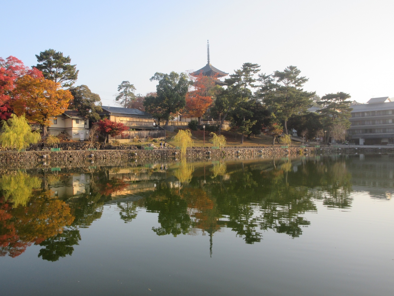 奈良に滞在中、朝の散歩で訪れました。近鉄奈良駅から東大寺に向かう道路沿いにあるため、いつも人通りが多い池ですが、朝だったため人影も少なく静かで、池越しに見える緑に囲まれた興福寺の五重塔と、池の周囲に植えられた柳の木々を眺めながら、のんびりした朝を過ごすことができました。写真撮影のスポットにもなっています。
