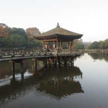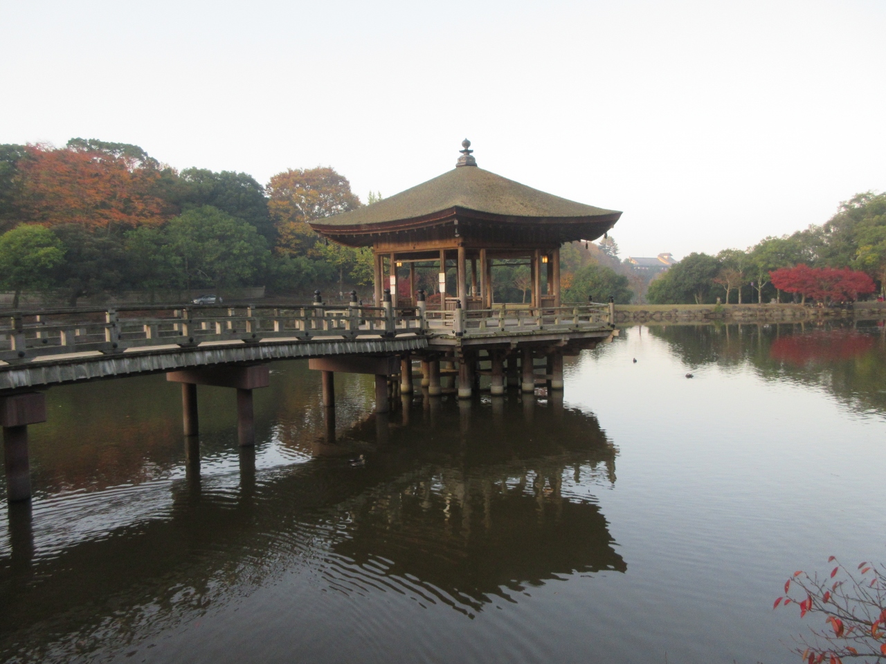 奈良公園内に水をたたえる鷺池に浮かぶ檜皮葺の六角形のお堂です。池を眺めることができる休憩所にもなっていて、鷺池のアクセントにもなっています。早朝訪れた時は、池のほとりで若草山から昇る太陽をバックに写真を撮る人たちが見られました。浮見堂と日の出、浮見堂と紅葉など、写真撮影のスポットにもなっているお堂です。