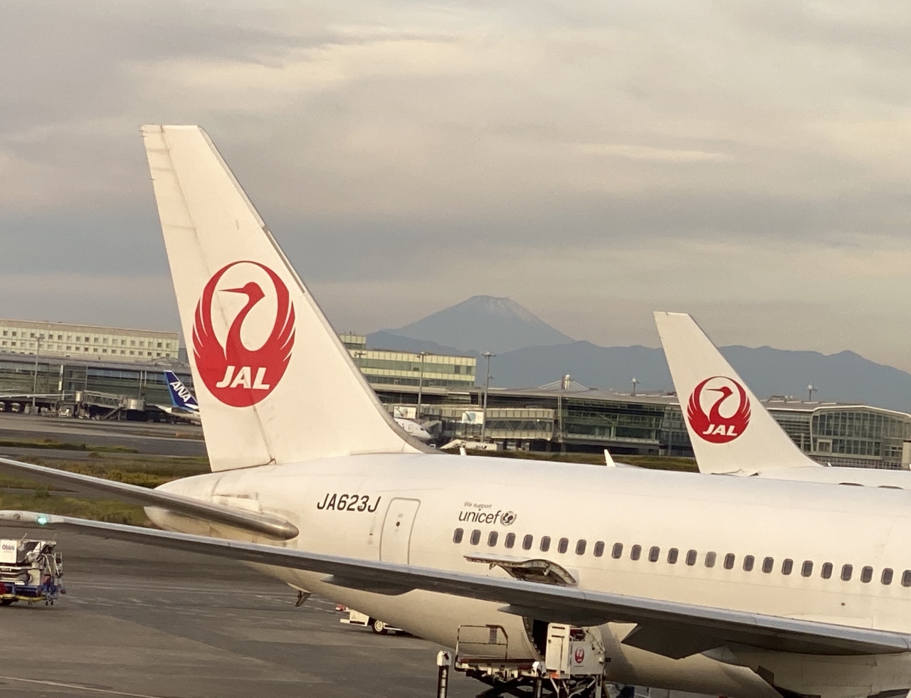富士山がはっきり見える朝で、富士山をバックにJALの飛行機が緩やかに行き来します。