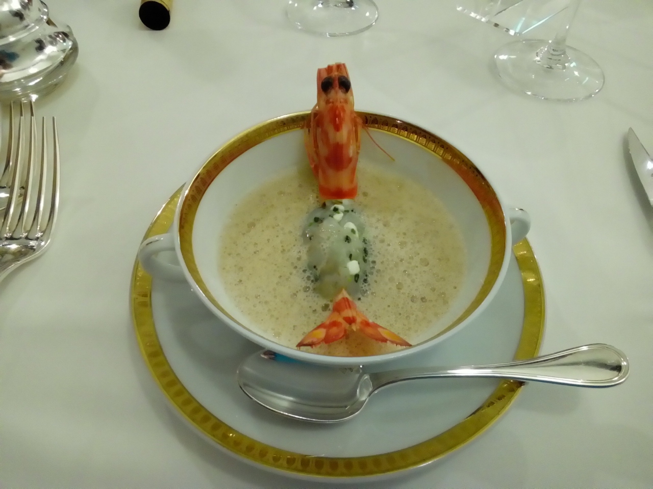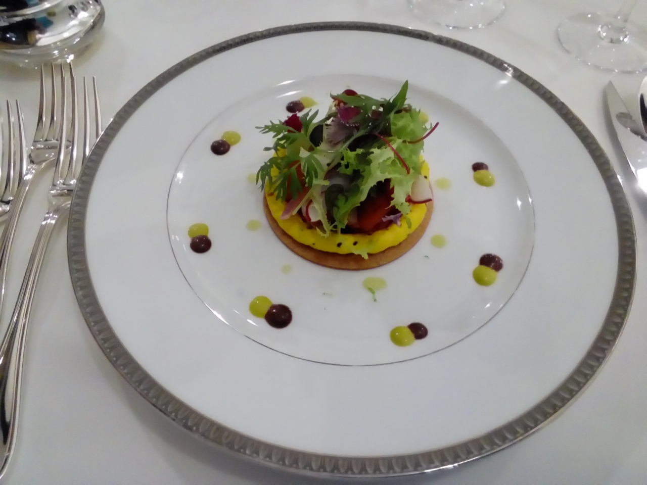 コースで、アミューズ、前菜でオマール海老とマスカットのタルトレット。暖かい前菜は車海老とイカのタルタル。魚料理はカワハギとフォアグラ。グラニテ。肉料理は鴨肉のロティ。チーズとデザート盛り合わせ。