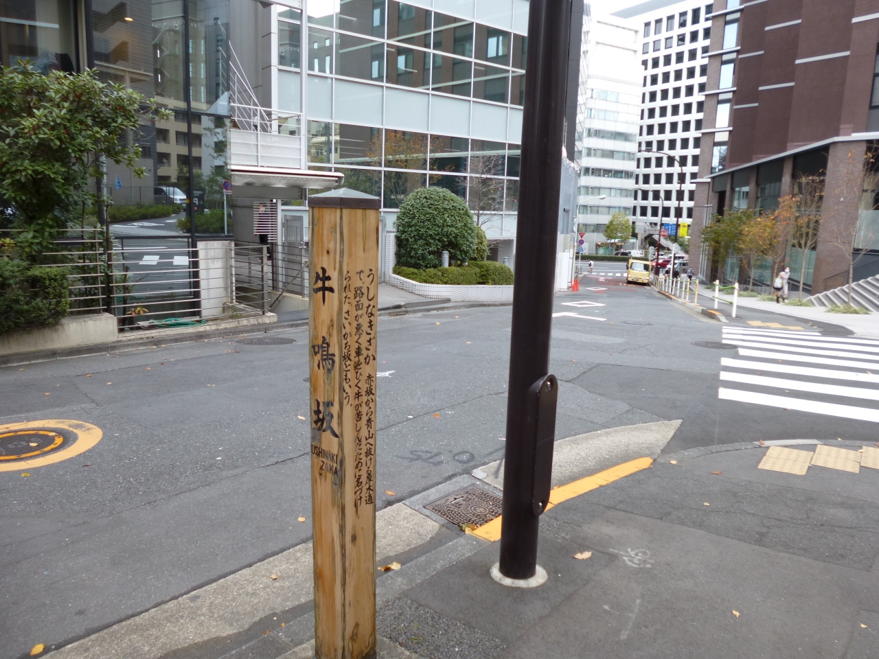 青山通り沿いにある「国際医療福祉大学東京赤坂キャンパス」のすぐ西脇から南にのびる坂が「牛鳴坂」です。標柱の案内書きによると、かつては道が悪くここを通る牛がよく鳴いたのが名前の由来ということです。当然の事ながら今は全くその面影はありません。往時のイラストなどが残っていれば見て見たいと思います。