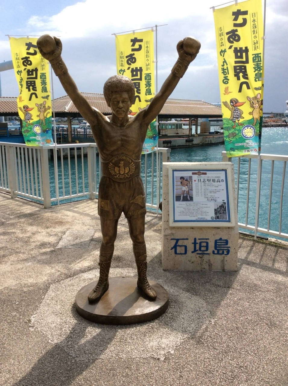 桟橋には具志堅用高さんの金色の銅像がありました。