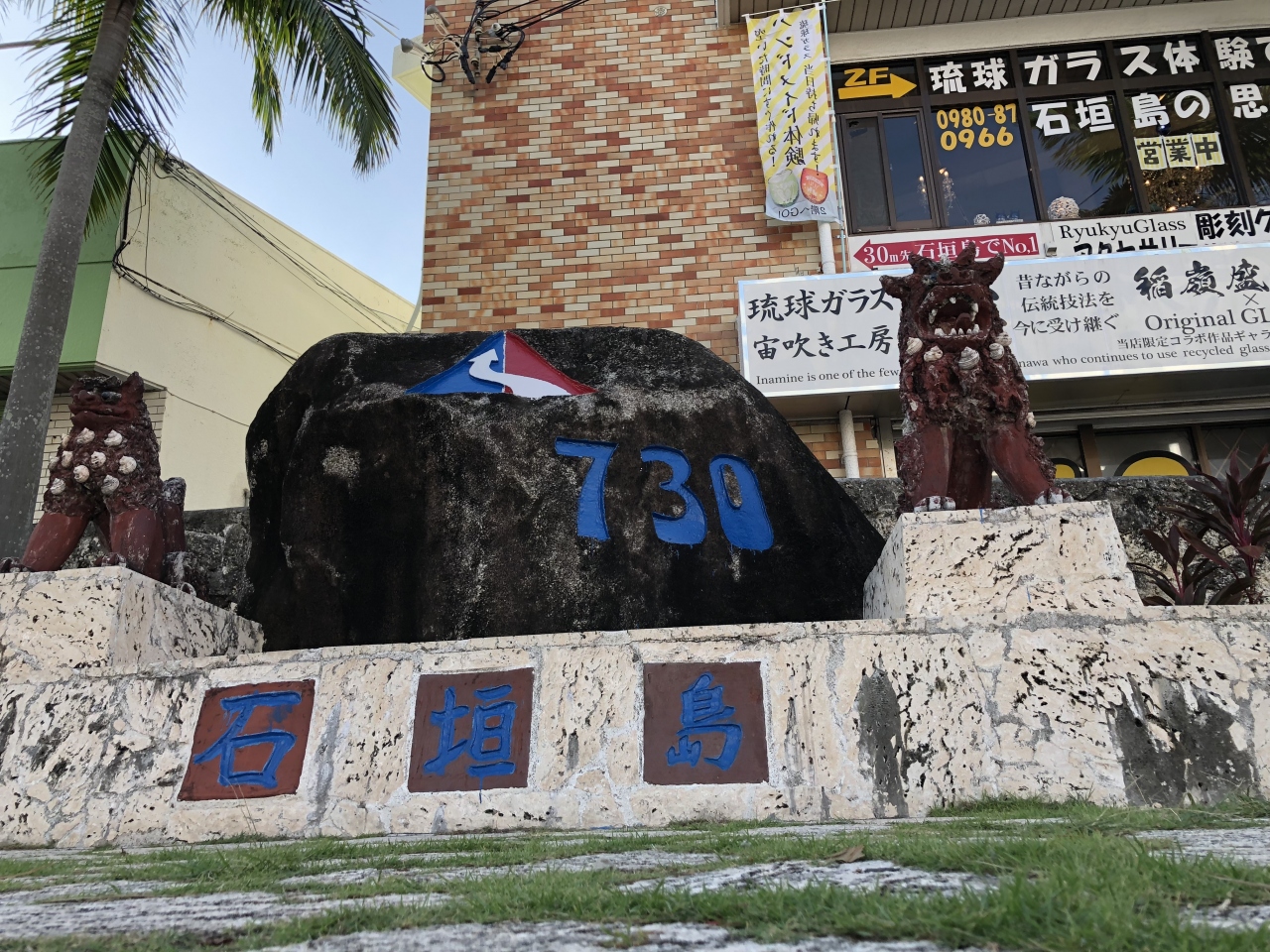 日本復帰後、米国式から日本式へ車を右側通行から左側通行に切り替えた1978年7月30日を記念しているとのことです。わずか8時間の間に県内すべての道路標識や表示の切り替え作業を行ったそうです。標識両脇にはシーサーが鎮座していました。