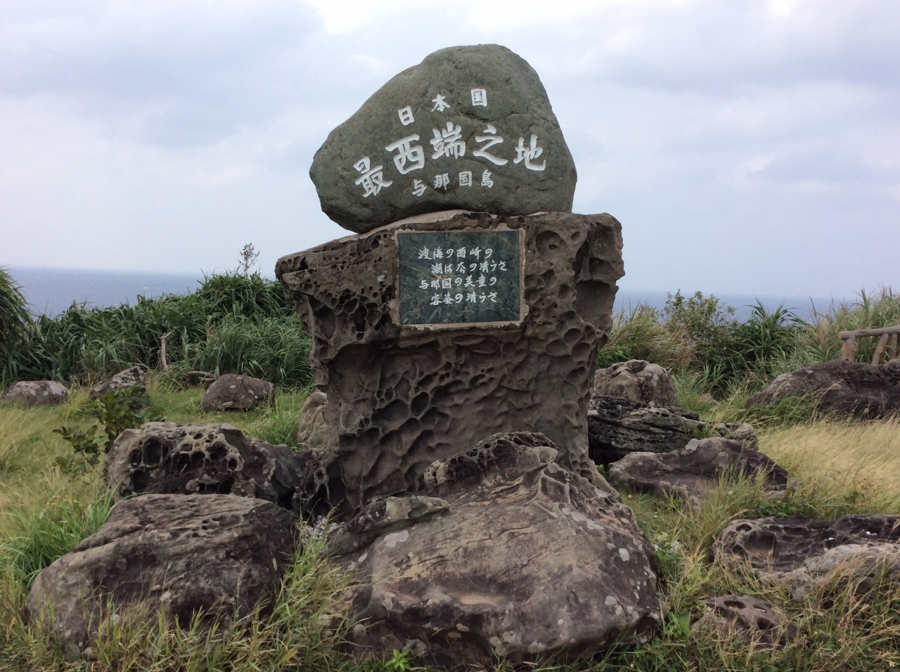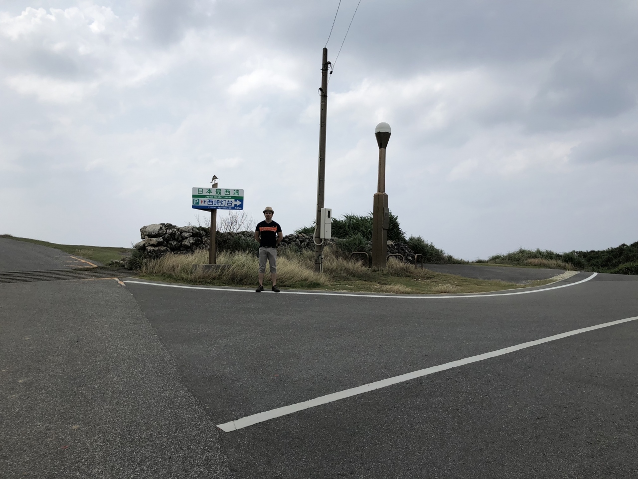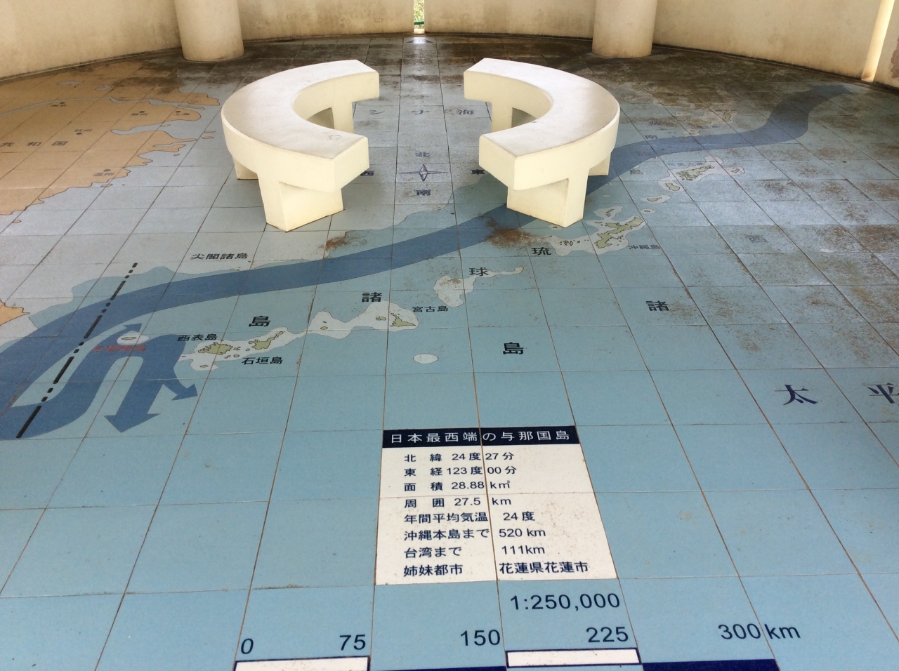 岬には石碑と灯台と東屋があります。東屋の床にはマップがありました。ここから西111㎞先に台湾があります。が、それ以上に驚いたのは、与那国島から沖縄本島までが520㎞だそうです。これって東京大坂間よりも長いですよね。台湾の近さよりも、沖縄本島への遠さの方にびっくりしました。