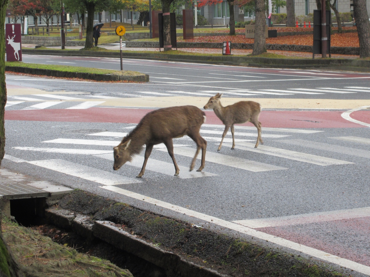 どのように数えたかわかりませんが、奈良公園内に1300頭以上の鹿がいると言われる奈良公園を早朝散歩しました。横断歩道をゆっくり渡る鹿、道路を横切る鹿、道路の真ん中を闊歩する鹿など、いろいろな鹿の姿を見ていて楽しくなりました。車は鹿の前では最徐行したり大回りしたりと、鹿には決して触れまいとする様子が見られ嬉しく思いました。人と鹿が共生している姿が見られた奈良公園周辺です。