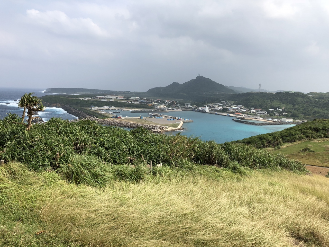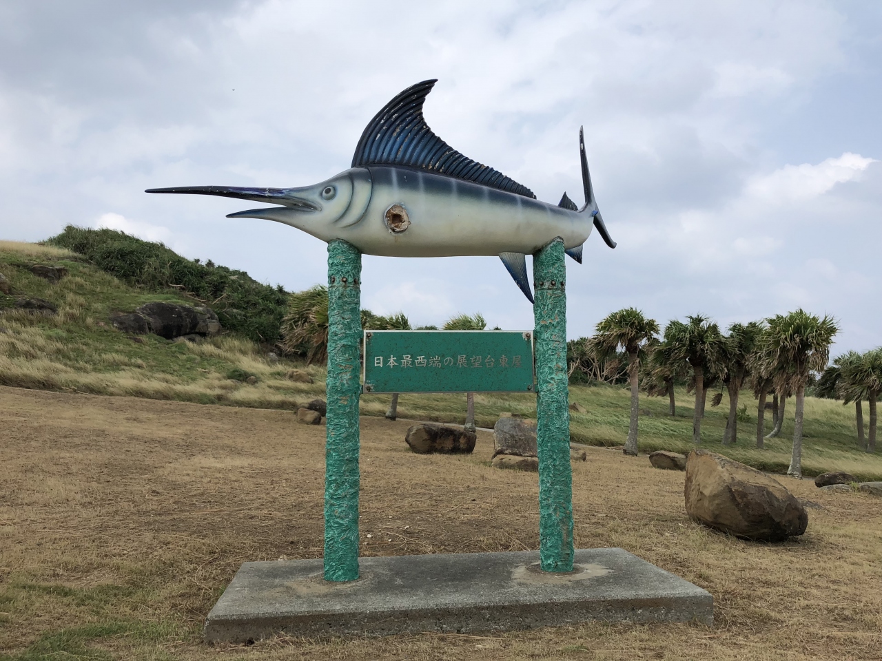 岬には最西端の石碑と灯台と東屋風の展望台があります。展望台の床にはマップがありました。ここから西111㎞先に台湾があります。が、それ以上に驚いたのは、与那国島から沖縄本島までが520㎞だそうです。これって東京大坂間よりも長いですよね。台湾の近さよりも、沖縄本島への遠さの方にびっくりしました。展望台からは、今登ってきた日本最西端の久部良集落も見渡せます。
