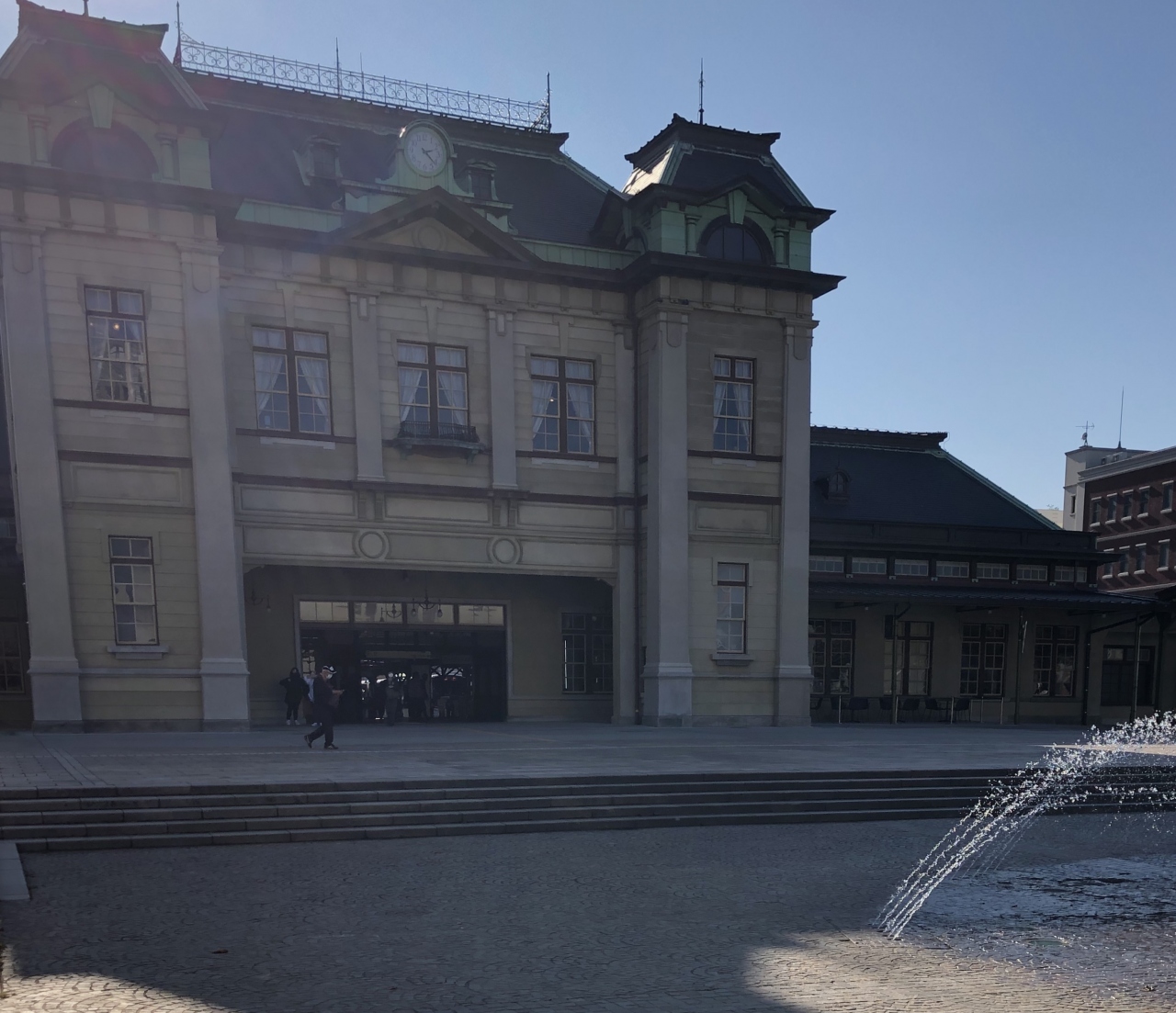 ネオルネッサンス様式の、西洋風な2階建ての、レトロな駅舎がリニューアルされ完成しました。大正3年(1914年)に創業された当時の姿がよみがえりました。プラットホームの表示もレトロです。復員兵らが、喉を潤した帰り水もあります。