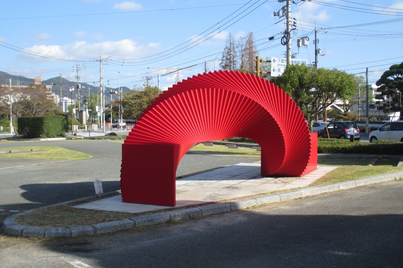 展示替えなのか、臨時休館していましたので、屋外展示の彫刻を見て廻りました。いろいろ不思議な形のものがあって興味を惹かれました。中でも、赤い大きなものに見入ってしまいました。縦方向に見ると、スクリューが廻っている様な、横から見ると、バネ入りの蛇腹がころんころんと回転していきそうでした。まったく解釈が違っているのでしょうが、見る人の勝手ですよね。田辺武さんの「Locus of Time 08-1(時の軌跡)」とのことです。2008年制作で、ステンレス鋼だそうです。