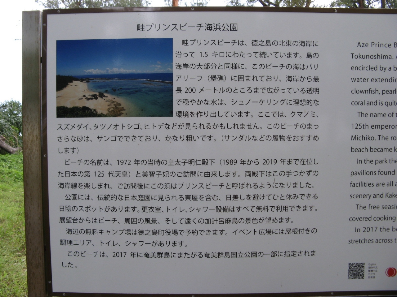 徳之島空港から車で30分足らず、徳之島の北東部に広がる海岸です。現地にある説明板には、長さ1.5kmになる海岸で昭和47年に現在の上皇陛下が皇太子時代に美智子様と散策をされたことから命名されたビーチとありました。