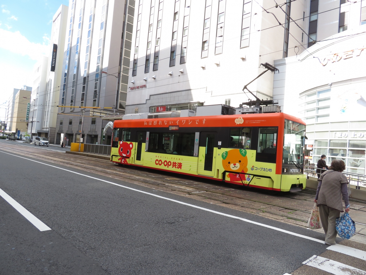 市内の移動に便利な路面電車、運行本数が多く、すぐに乗れます。料金は一律170円、私は障害者手帳提示で半額なので90円、小銭を用意して乗りました。車両のデザインは人気の、ゆるキャラ・みきゃんからモダンなデザインまで色々、見てるのも楽しいです。