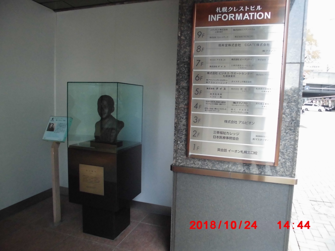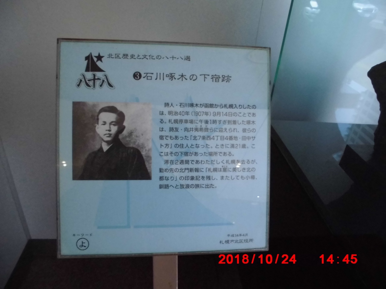 北海道大学の見学を終えてから西五丁目樽川通りを札幌駅に向かって歩いている時に見つけました。偶然だったのですがクレストビルの1階のちょっとくぼんだ所にガラスケースに入った像があったので近寄ってみたら石川啄木の胸像でした。横にあった説明板によると下宿跡とのことでした。