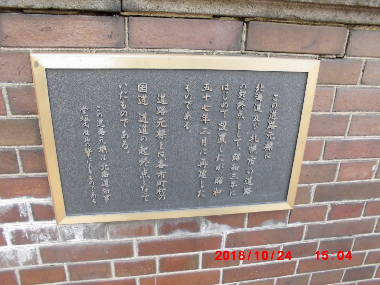 旧北海道庁舎の赤レンガ館の入り口前(入り口手前の右側)に立っていたのが札幌市道路元標の碑です。高さ50センチほどの碑なので、以前赤レンガ館に立ち寄った時は気ずかずに通り過ぎてました。今回は写真を撮っている人が居たので碑に彫られている文字(薄くなっていて読みづらかった)をよく見てみると、札幌市道路元標と縦書きされていました。