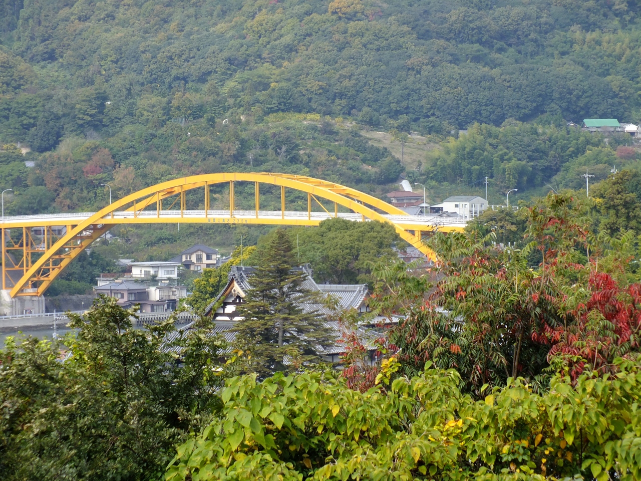 アーチ式の橋脚が岸から出ていてデザイン的には今はやりのハープ橋のようにお洒落では無いですが、紅葉の軽視には調和がとれた橋です。