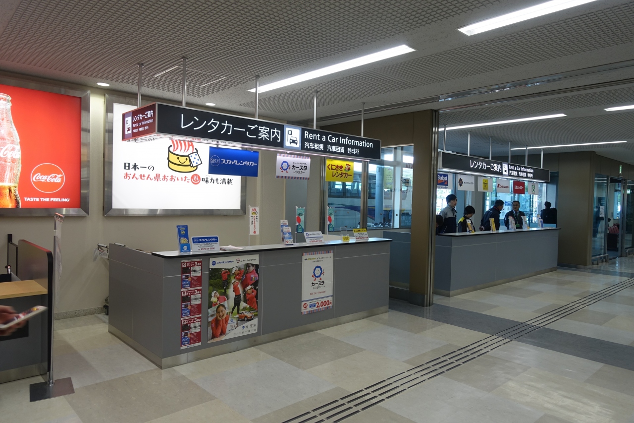 空港の到着口を出た先に各社レンタカーのカウンターがあります。事前に予約済みなので名前を告げるだけでOK。人数が集まり次第ワゴン車で営業所まで無料送迎してくれます(もちろん帰りも)。空港から営業所まで送迎車で3分と近いです。
