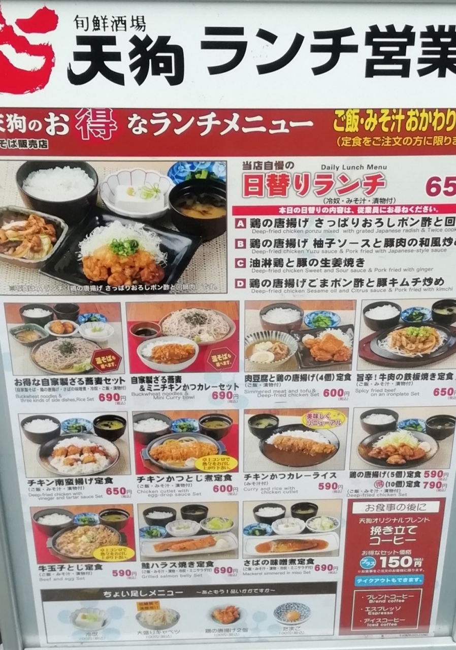JR東京駅八重洲中央口から徒歩5分、八重洲通り沿いにある居酒屋天狗です。ビルの地下1、2にあり、かなり広い店舗です。しかもランチメニューが12種類も。外国人向けのメニューなのか、蕎麦のセットもあります。ざる蕎麦、唐揚げ、さば味噌煮、冷奴、ご飯味噌汁おかわり無料で690円。これは、お得です。