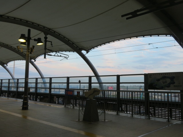 夜に着きましたが、30分くらい待ちました。まあ空港のアクセス線ですから仕方ないですね。こちらの駅は珍しく完璧にオープンエアです。おそらく冬は非常に寒いでしょうが、混雑したときはコロナ対策バッチリです。先見の明があったんですね。