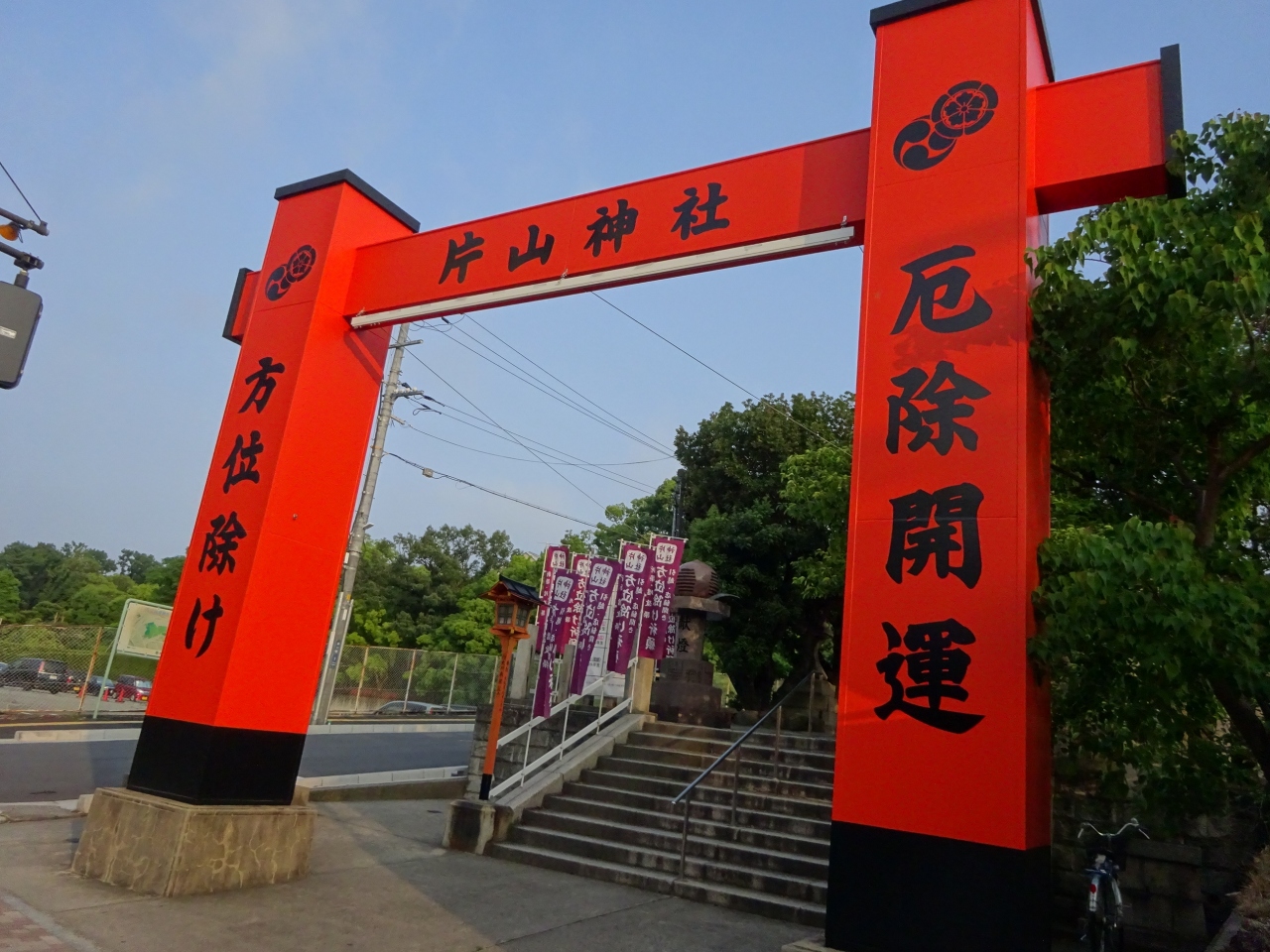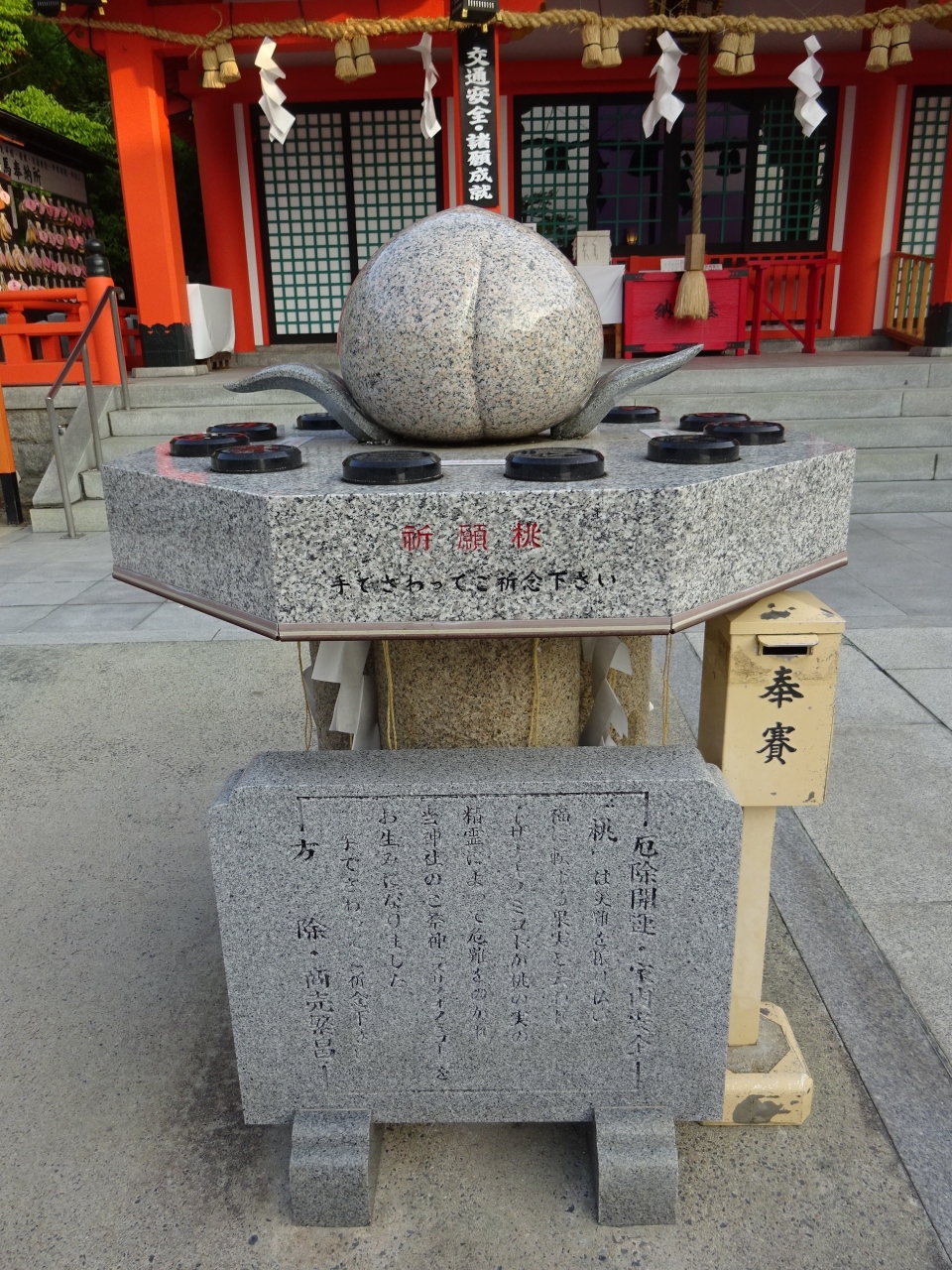 JR吹田駅からほど近く幹線道路のアサヒビール吹田工場の向かいに片山神社があります。普段から近所の人が散歩のついでに訪れます。境内には石でできた祈願桃があって「手でさわって御祈願ください」と書かれていました。