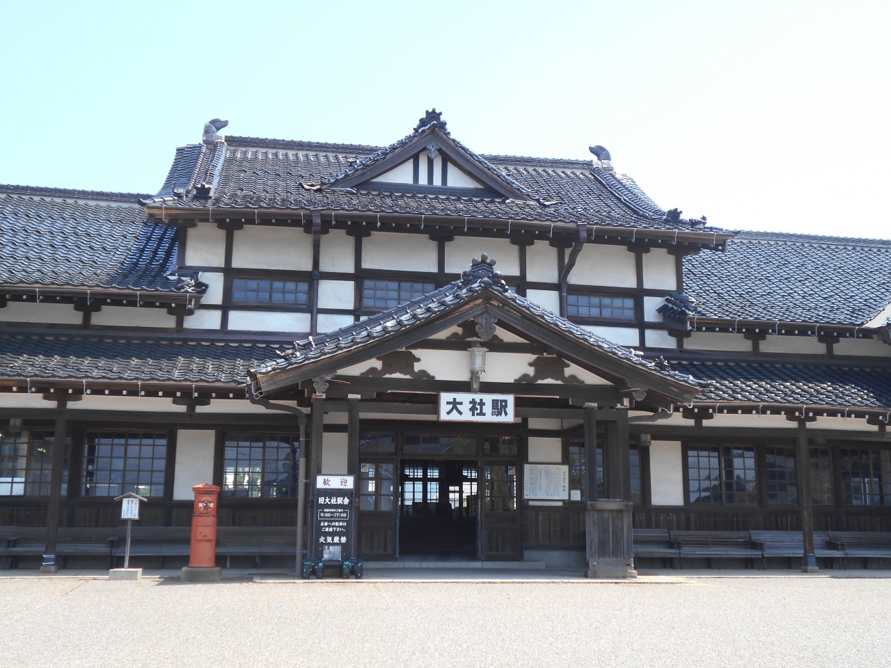平成2年にJR西日本の大社線が廃線となりましたが、それまでは出雲大社の表玄関として活躍してきました。この駅舎は1924年に改築されたものです。神社様式外観の木造建物は堂々としており、歴史を感じます。また、内部は洒落たシャンデリアが下がるなどモダンな雰囲気です。駅前は駐車場となっています。