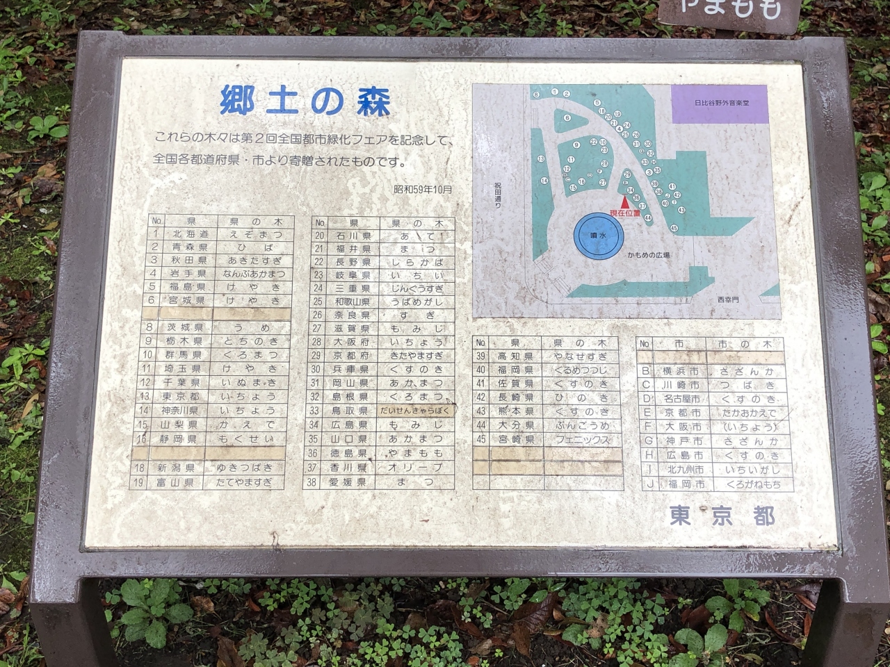 日比谷公園を散策しているときに通りかかりました。1984年の第2回全国都市緑化フェアを記念して全国の都道府県から寄贈された木があるとの説明でしたが、いくつかなくなってしまっているようで案内板に印がつけられており、管理の大変さがうかがわれました。
