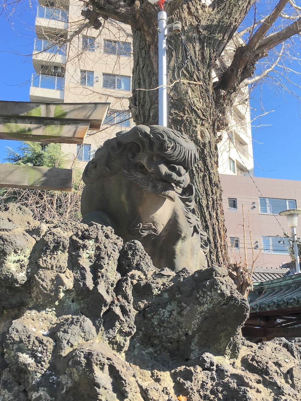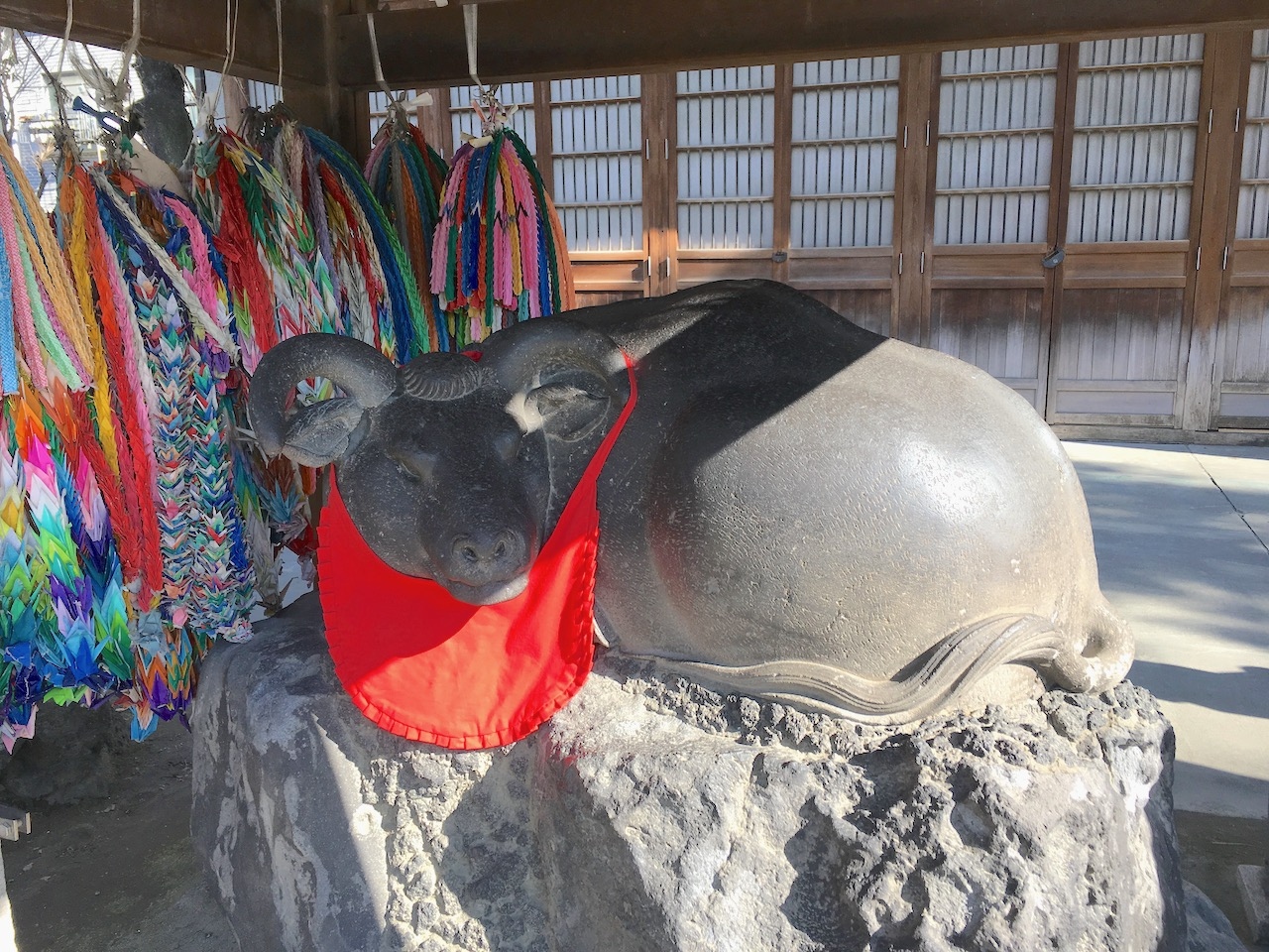 さわると健康になるという「撫で牛」の石像があり、背中のあたりを撫でてきました。