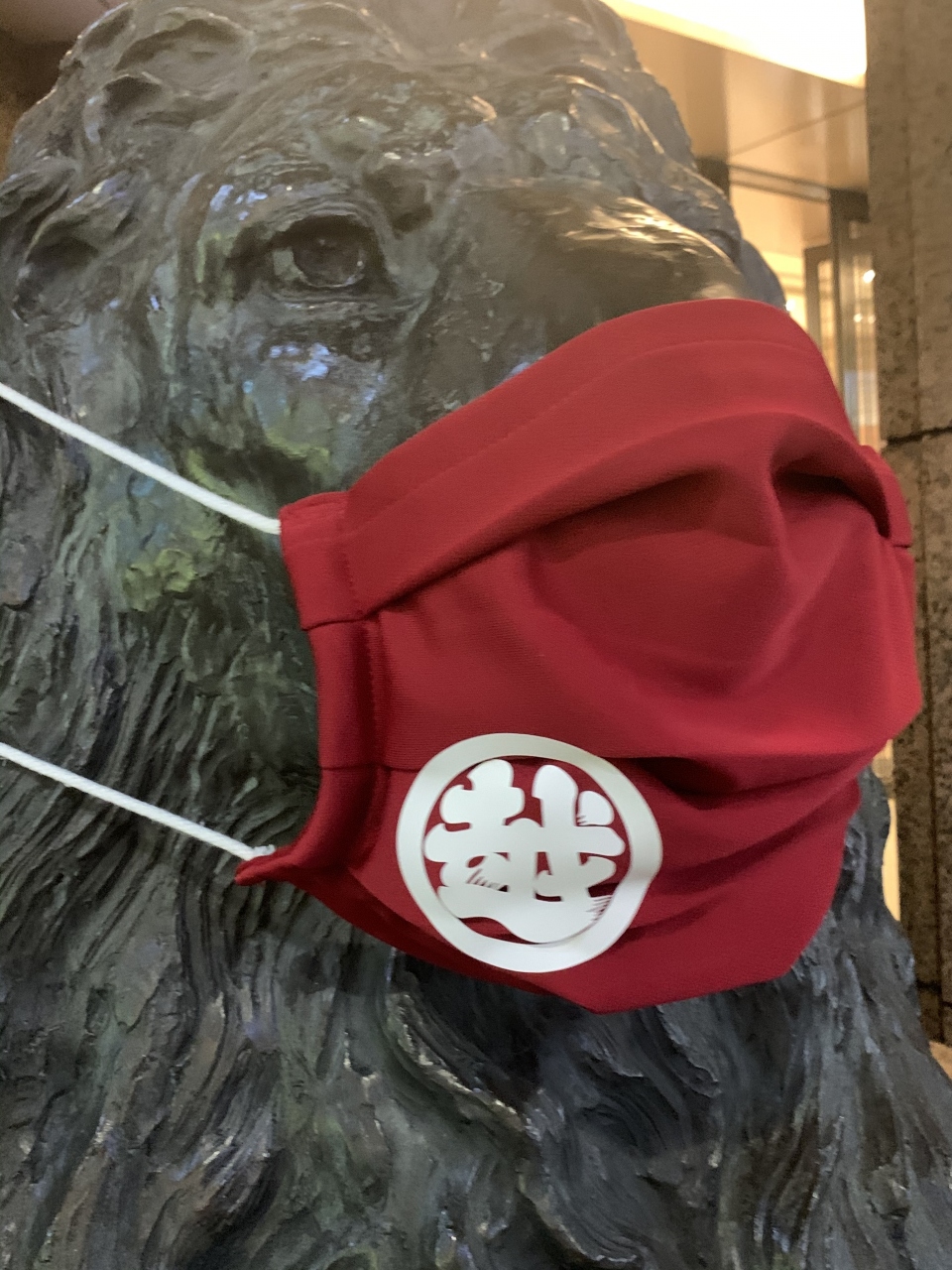 今回、入り口そばにある「ライオン」が 大きな赤いマスクを着用していました。