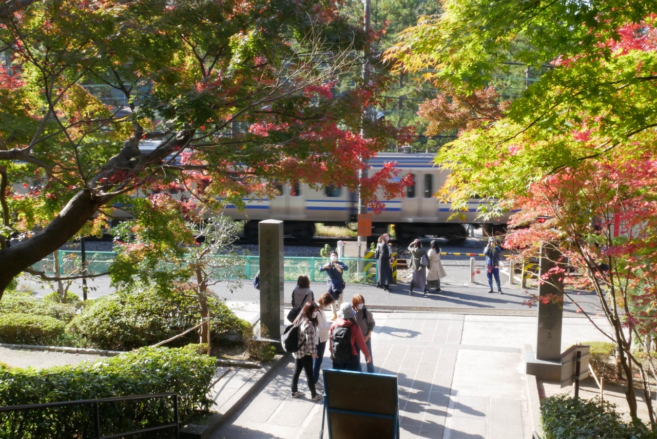 踏切前から見上げて緑と紅葉のコントラストがなかなかよかった