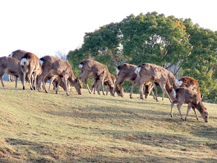 鷺池の南側を東に向かって散策してから広い通りに出て左折、東大寺方面へ北へ向いて進んでいくとすぐ右手に広大な芝生広場が見えました。ちょうどいい具合に鹿の群れが並んでいたので、いかにも奈良公園という1枚を狙ってみました。
