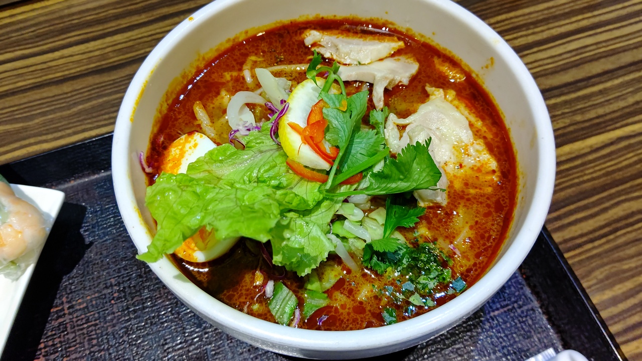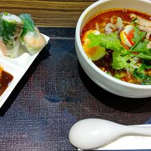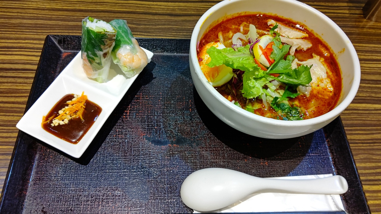 ミッドタウンの地下にあるこちらのお店に再訪。以前にも食べたトムヤムフォーと生春巻のセットをいただきました!