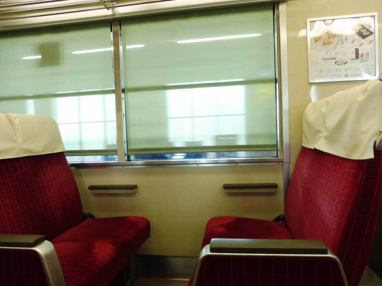 シートはえんじ色の転換クロスシートで白の枕カバーまで付いてる電車、少しレトロ感があるところも気に入ってます。