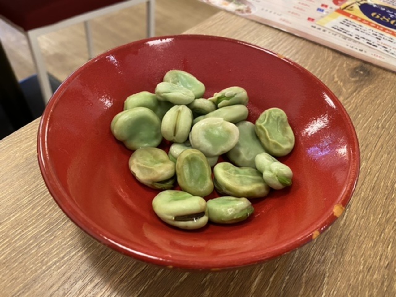 先ずはつまみ2品と日本酒1合1,180円のセットを!つまみはなめ茸おろしとそら豆を、日本酒は久保田の千寿を選びました。