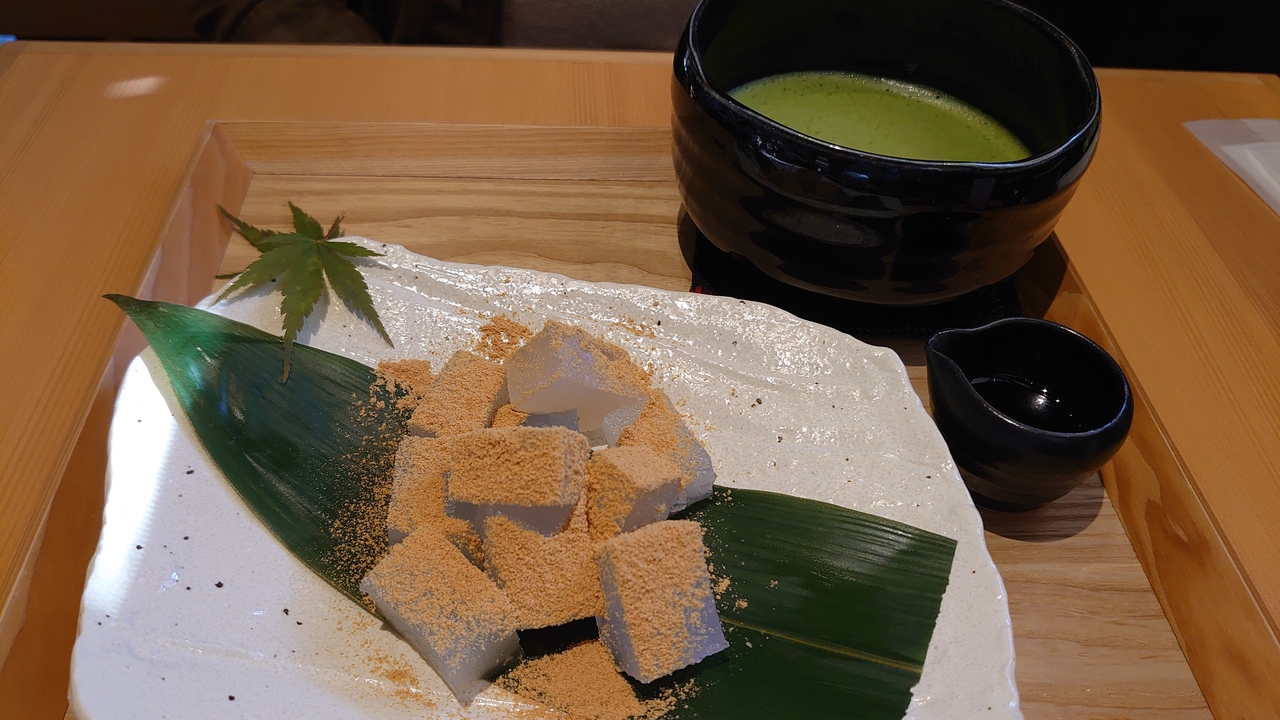 わらび餅に黒蜜ときな粉をかけて上品な味わいとのこと。
