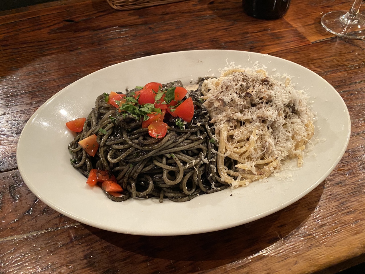 先ずは生ビール!そして沖縄紅豚のポルケッタ!赤ワインをボトルで。赤ワインに豚肉の脂が合う。〆はトリュフオイルクリームとイカ墨のダブルスパゲッティで(^^)
