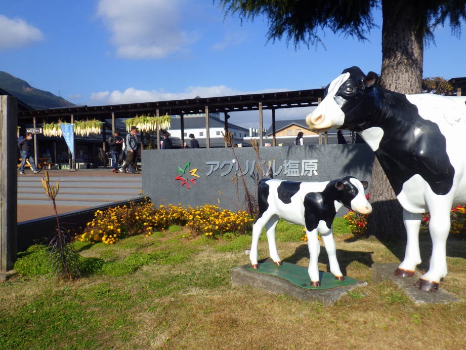 道の駅「湯西川」から45分ほどで、54軒の道の駅「湯の香しおばら(アグリパル塩原)」に到着しました。入り口に牛のオブジェがあるだけあって直売所には酪農品が多かったです。「ベーコンの切り落とし」、新そばの「生そば」、「大根の甘酢漬け」を買うことができました。
