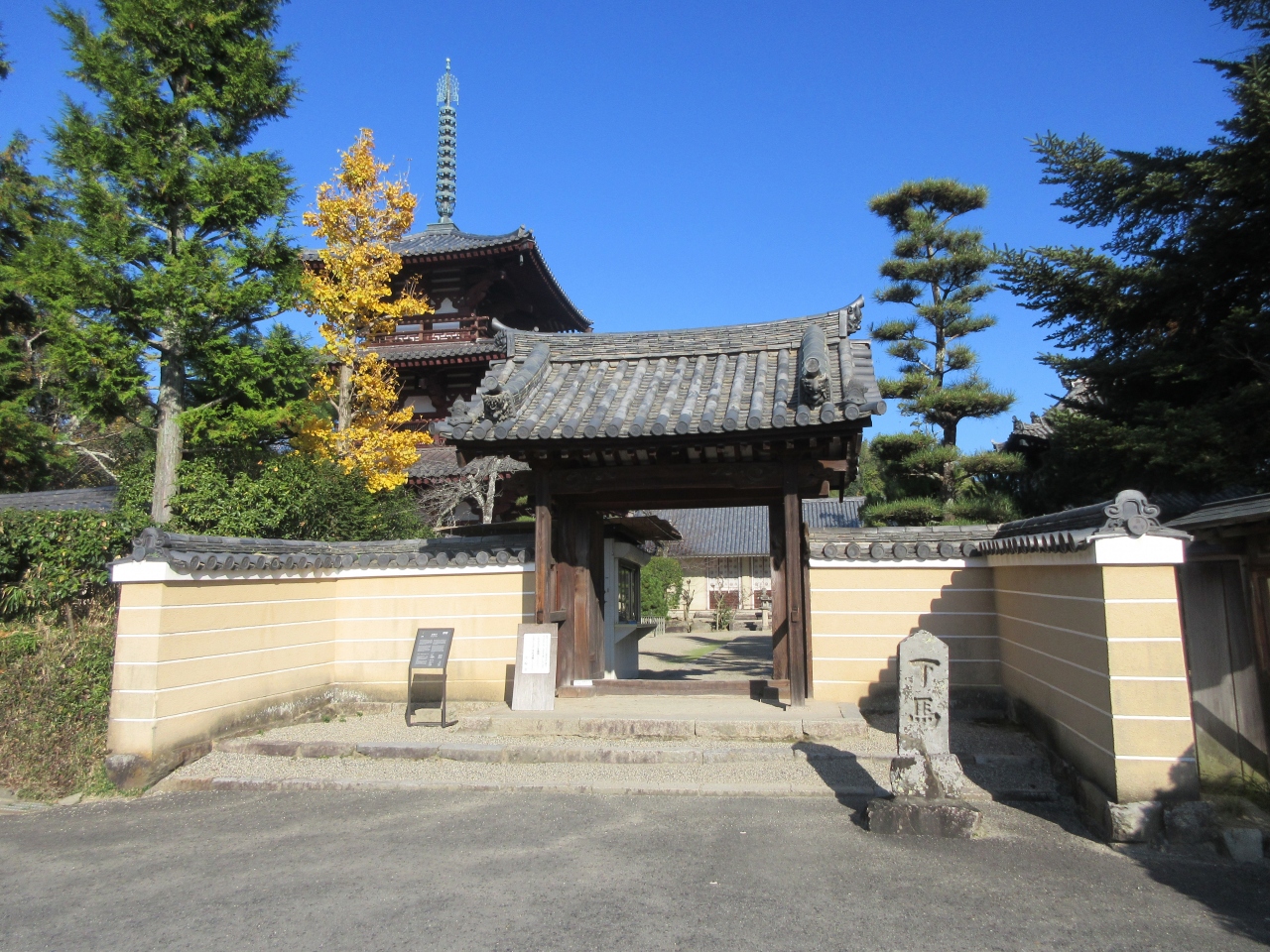 国宝だった三重塔は1944年に落雷で焼失しました。戦後、作家幸田文や多くの人々の支援により1975年に高さ25mの三重塔を再建しました。住職や地元の方たちの思いが詰まった新しい三重塔です。法輪寺南門に入る前に見た三重塔は趣がありました。斑鳩三塔(法隆寺五重塔、法起寺三重塔、法輪寺三重塔)を離れた場所から眺めると穏やかな気持ちになりました。