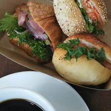 フランス弁当と名のついた惣菜パンのセットとコーヒーで560円、比較的リーズナブル。サーモンやハムをつかったものでまずまずおいしい。