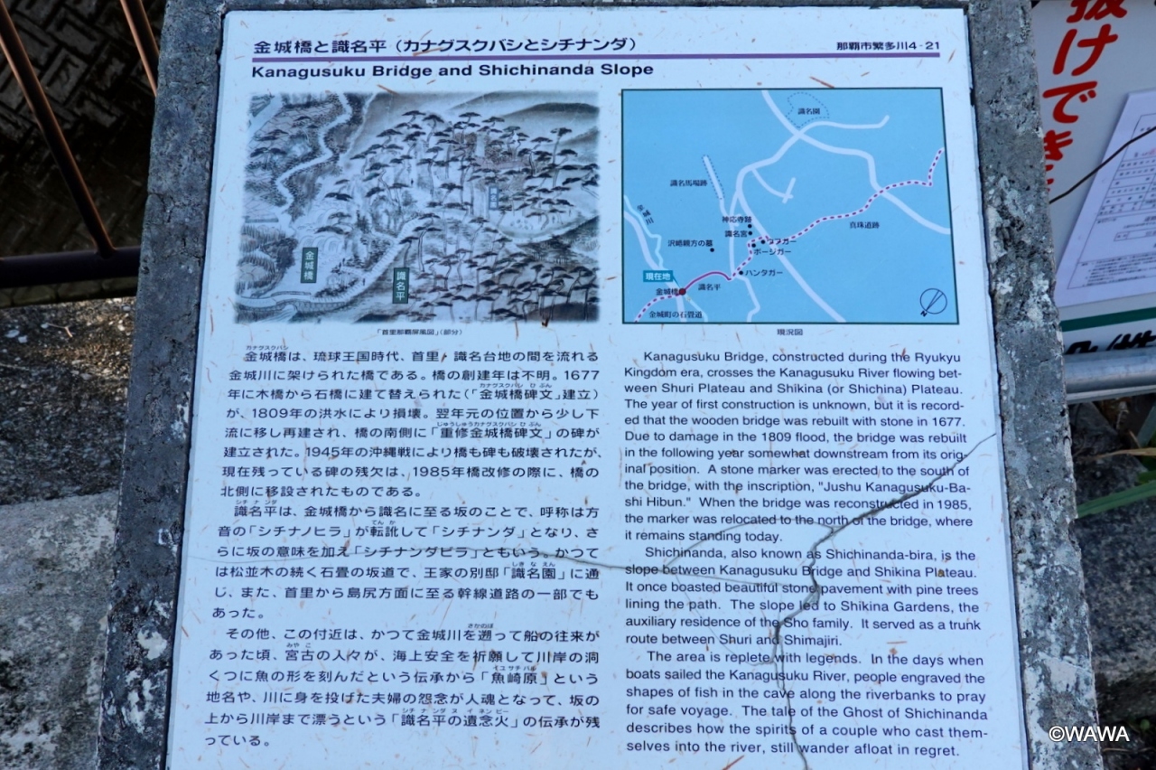識名平(シチナンダ)はその先の識名まで続く坂道のことのようですが、金城橋から見上げた限りではカラー舗装された普通の上り坂でした。