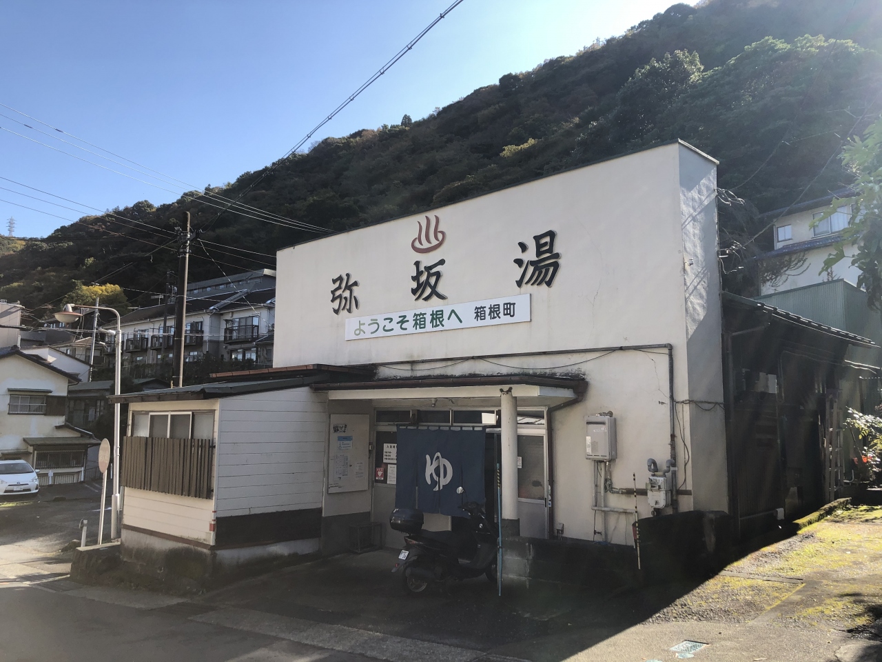 箱根湯本駅から路線バスで5分ほど、湯本中宿バス停で降りてすぐの所にある共同浴場です。入口には大きく「弥坂湯 ようこそ箱根へ 箱根町」と書かれています。