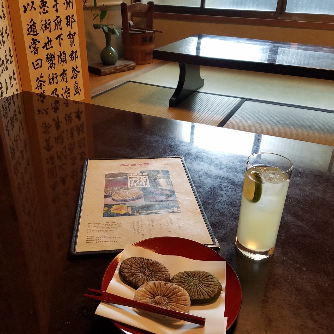 名物の焼き餅3つとすだちジュースのセットをオーダー。サービスで徳島のほうじ茶も頂きました。