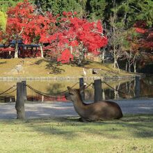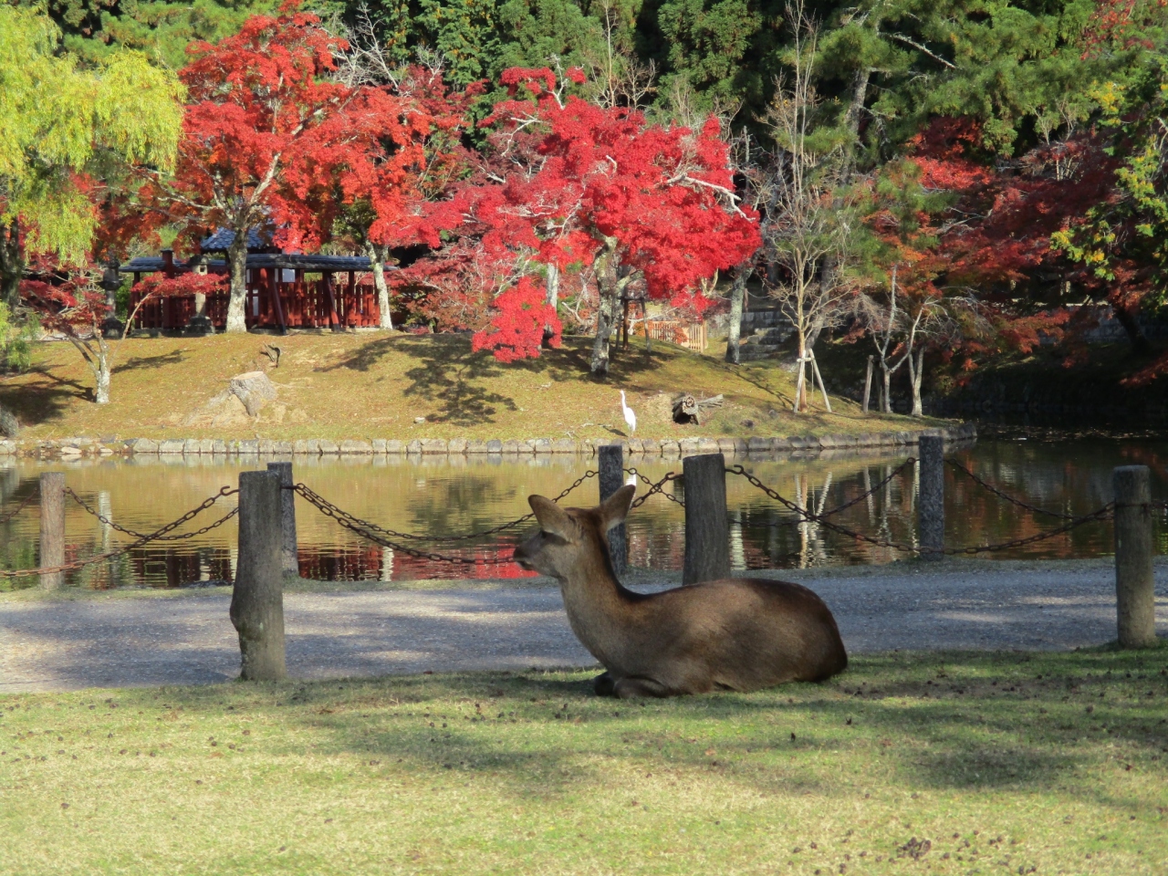 奈良公園のいたるところにいる鹿。奈良の鹿は神の使いとして大切にされています。自由気ままに闊歩しています。野生なので、おとなしい鹿ばかりではありません。ちょっとしたときにかばんの中にあるものを食べられたり、当たってきたり、突然ぺろっとなめられたりすることもあるので注意が必要です。あちこちで売られている鹿せんべいをあげると喜んで食べます。