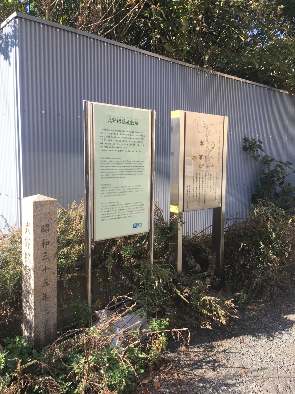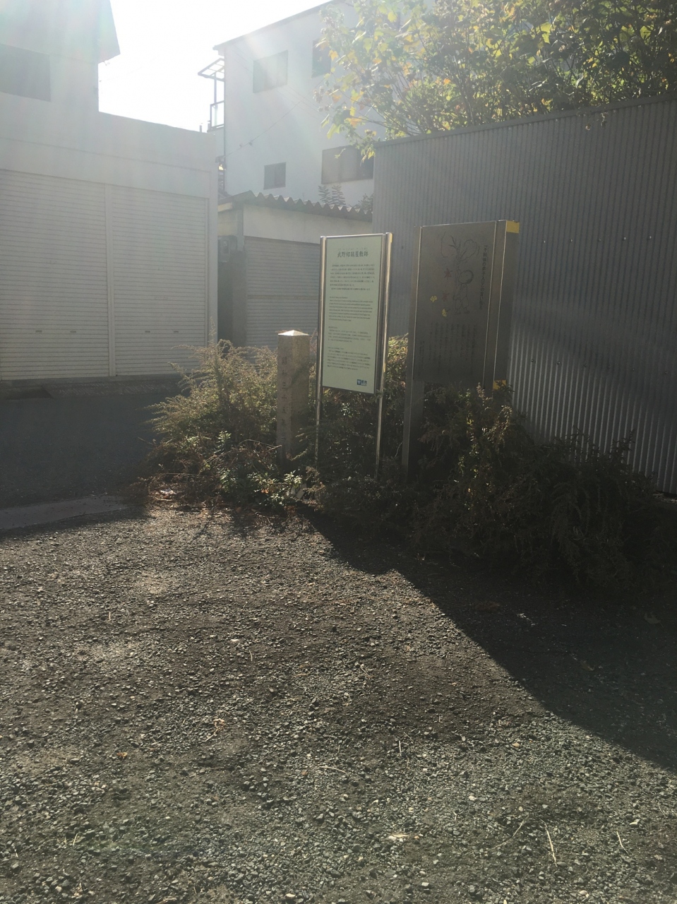 1502年生まれの大豪商です。今井宗久、千利休らにわび茶を伝えた人です。屋敷の面影は跡形もなく今は駐車場と周辺は住宅地になっています。横には千利休弟子入りの伝えという看板もありました。石碑と看板が草むらに建っていました。
