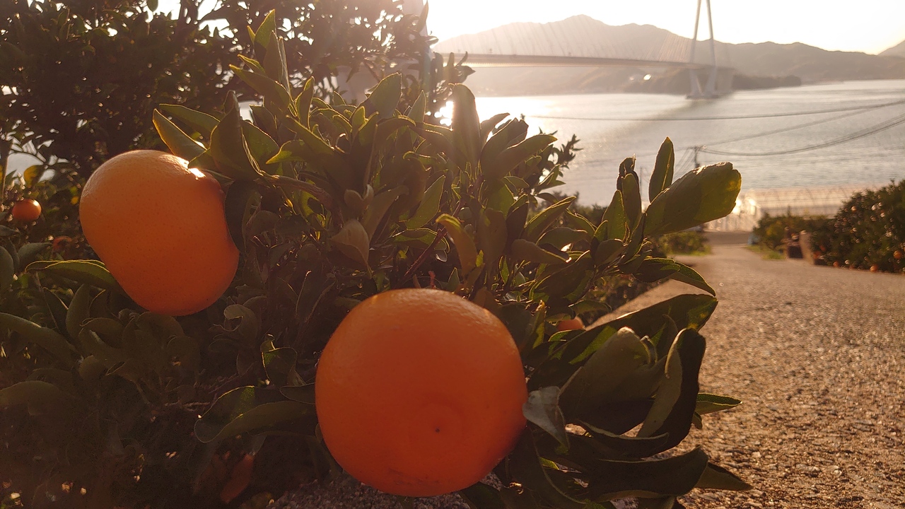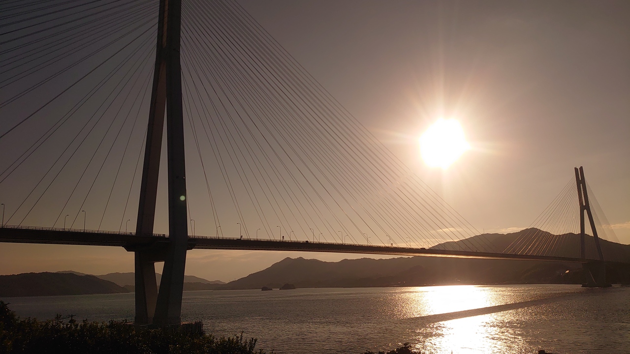 生口島のレモン谷を訪れた際、斜め前方に見えました。夕方、日が傾いていくと海面がきらきら輝いて綺麗なシルエットが浮かび上がりました。橋を渡ると愛媛県なんだなと思いつつここで引き返しました。旅の終着地として夕景が思い出に残りました。