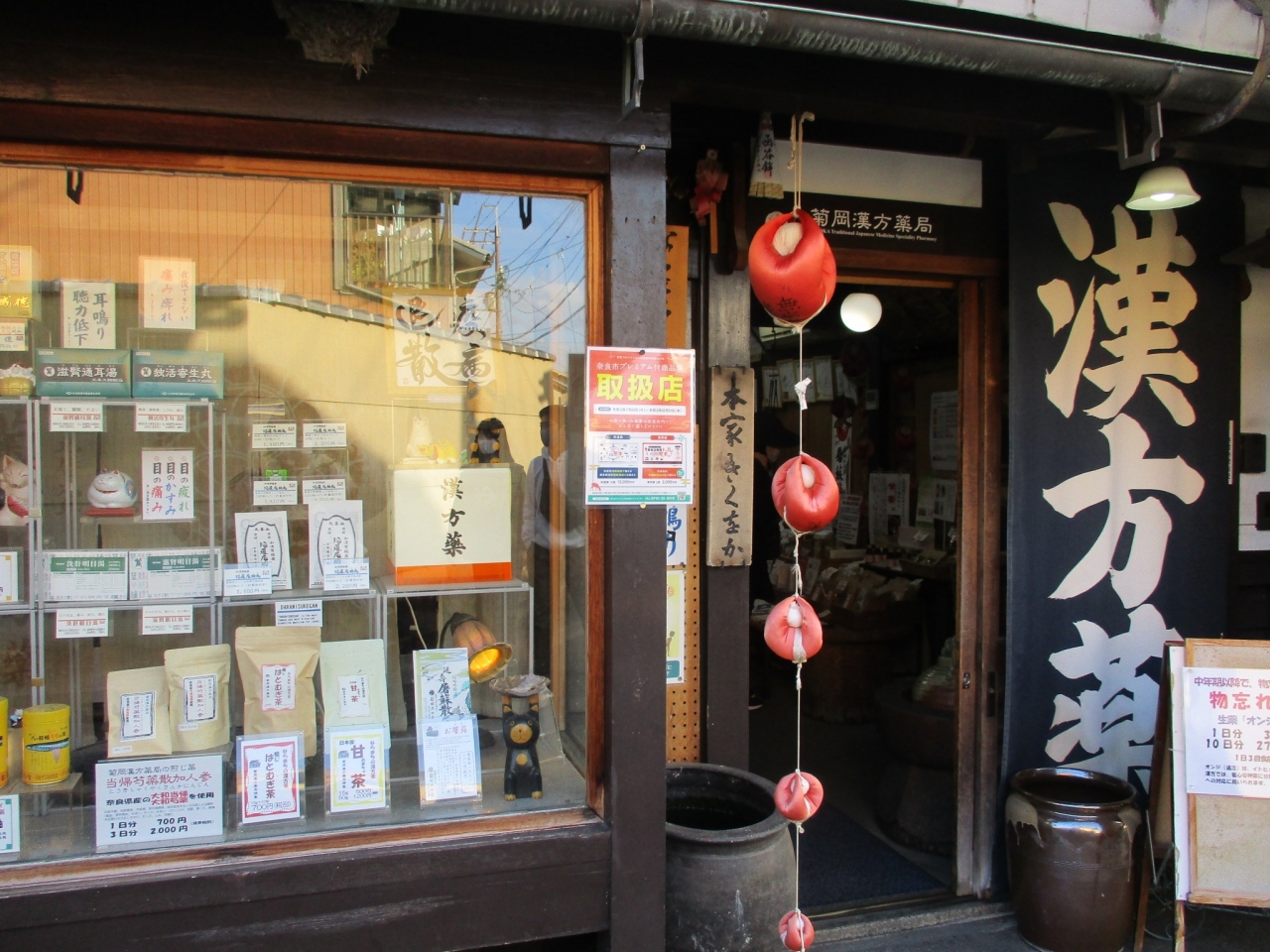 元興寺の近くに「漢方薬」の大きなのれんが目立つ古民家の薬局があります。24代続く老舗のお店です。思わず入ってみたくなる雰囲気です。店内には「陀羅尼助」というおなかの薬がありました。昔ながらのパッケージが気に入りました。お茶やショウガ飴などもあります。昔にタイムスリップしたかのような気分になりました。