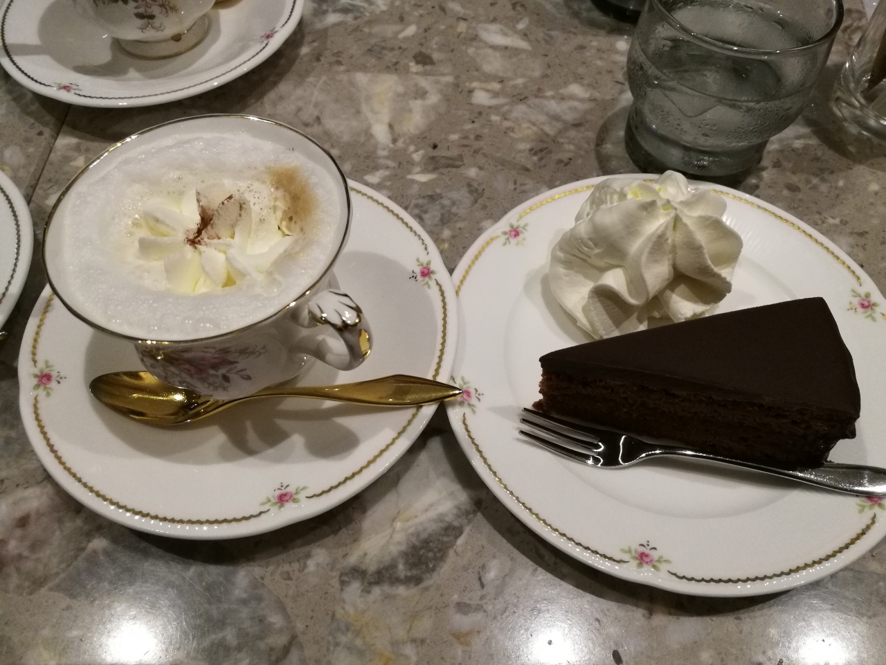 ウィーンを代表する伝統のチョコレートケーキであるザッハートルテもこのお店の名物だそうで、大きな塊の生クリームとそれぞれ甘い、甘くないのコンビネーションがとれています。コーヒーは、ミルクの泡と生クリームを浮かべたウィーンで一番親しまれているコーヒーとのことです。器はイギリスのロイヤルアルバートでした。