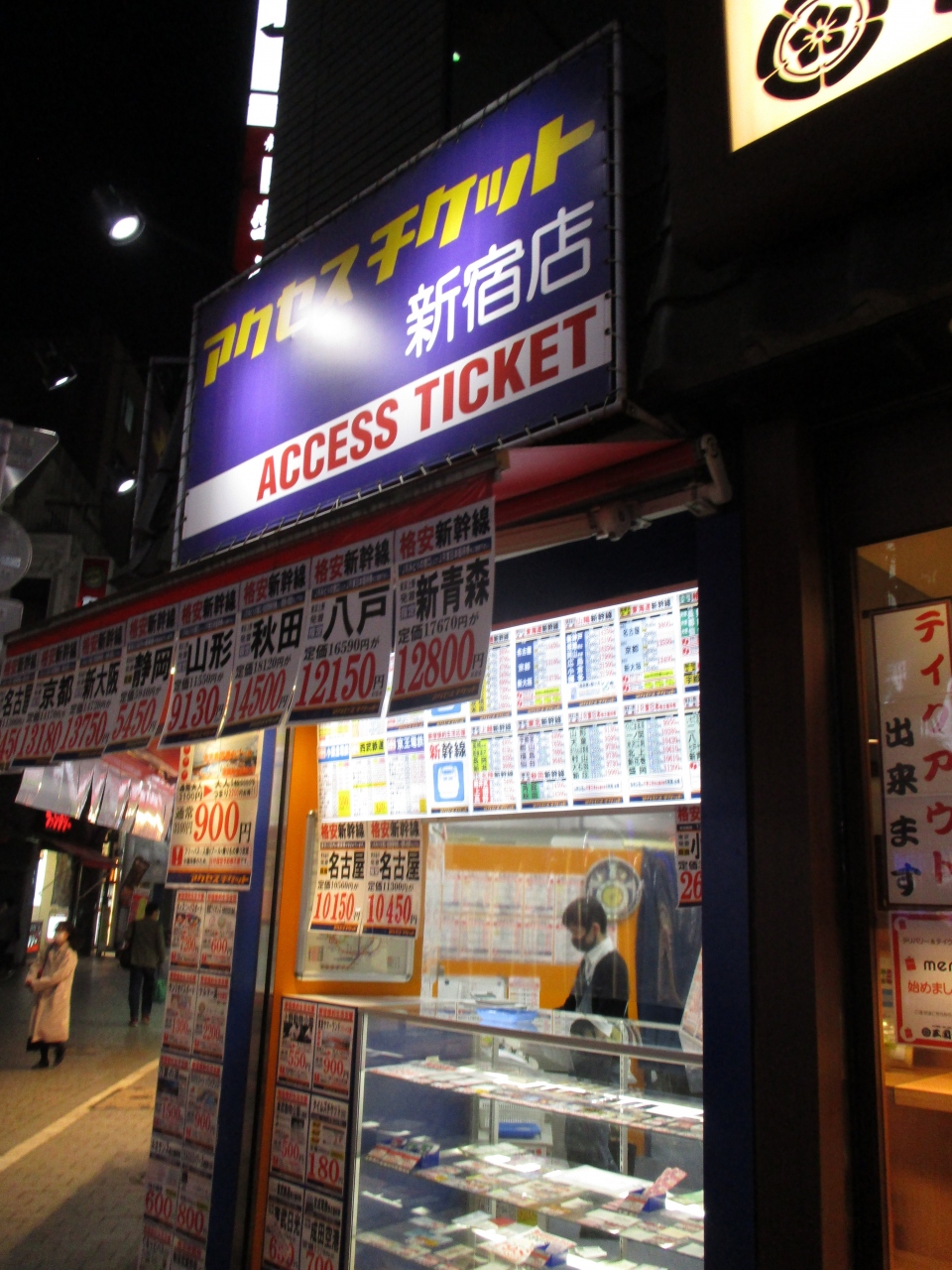新宿東口から歌舞伎町へ向かう途中にあります。電車の切符や株主優待券や商品券、ハガキ、入場券などいろいろ扱っていて、同じアクセスチケットでもお店によって若干値段が違うので、時間があると比べてみます。この日は東京サマーランドが900円で売られていました。