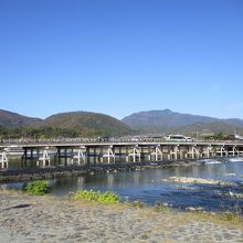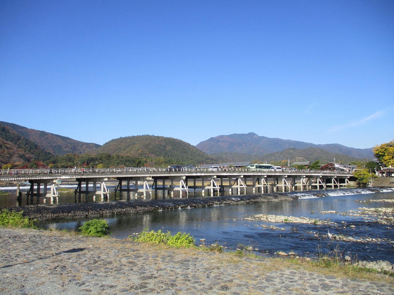 渡月橋の下流側は桂川です。渡月橋を境に大堰川と桂川と呼び名が変わります。桂川は一級河川で幅が広いです。橋の近くには中州(嵐山公園 中之島地区)があります。このあたりの景観はとてもよいので散策におすすめです。